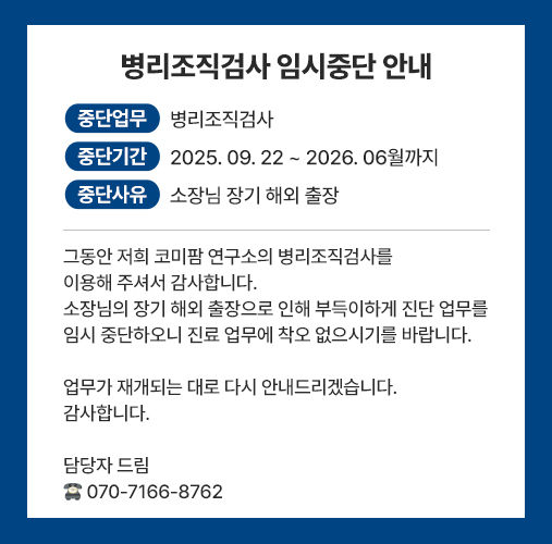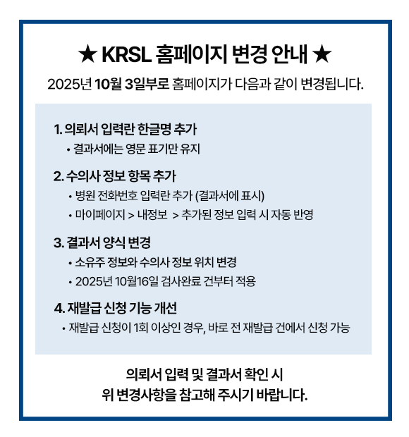 검사접수 바로가기 + 바로가기 Rabies Serology Laboratory 검사접수 + 바로가기 Check The Progress 검사진행현황 + 바로가기 Certificate Verification Service for a Quarantine Officer 진위확인 + 바로가기 Pet Community 반려동물 커뮤니티 + 바로가기 Test Request Guide 검사안내